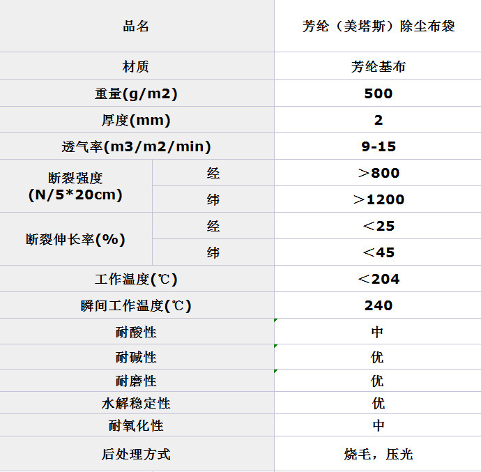 瀝青攪拌站美塔斯除塵布袋可在204度下連續使用,并可承受反復的250度瞬時波動溫度,尺寸穩定性好(250度時熱收縮率1%),防火性能好,400度時才分解碳化,不自燃也不助燃,低濃度的酸堿和大多數碳氫化合物對它無影響,良好的化學性,適用于瀝青混凝土攪拌瀝