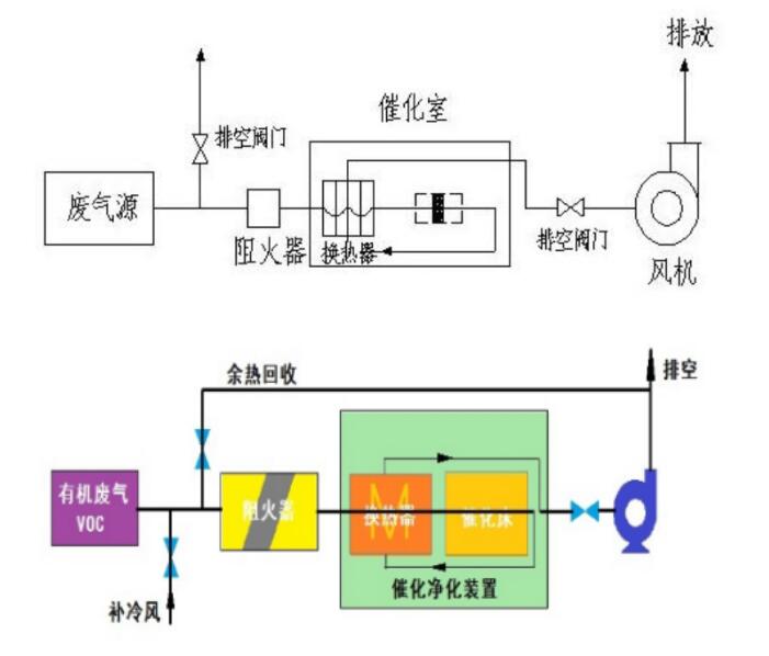 催化氧化技術(shù)(Catalytic Oxidizer,簡稱CO),通常是指將廢氣加熱到280℃以上,在催化劑的作用下將廢氣分解成CO2和和H2O,催化產(chǎn)生的高溫?zé)崃勘话迨綋Q熱器進(jìn)行循環(huán)熱交換,從而節(jié)省運(yùn)行能耗的一種VOCs治理技術(shù)。