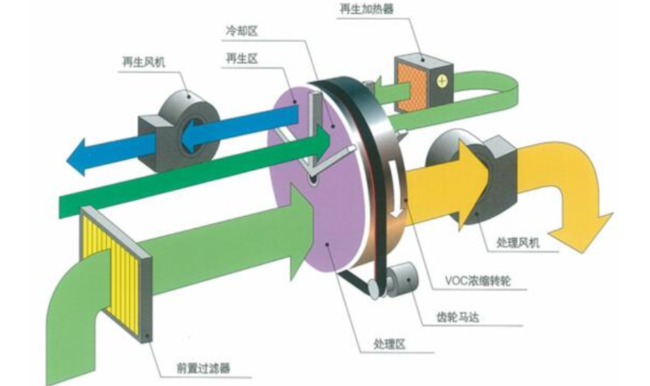通過轉輪的旋轉,可在轉輪上同時完成氣體的濃縮和沸石的再生。進入濃縮轉輪的有機廢氣在常溫下被轉輪吸附區(qū)吸附凈化后直接排放至大氣,接著因轉輪的轉動而進入脫附區(qū),吸附了有機物質的沸石在此區(qū)內(nèi)脫附,吸附在沸石上的有機物被分離、脫附、進入后續(xù)處理系統(tǒng),如此循環(huán)工作。